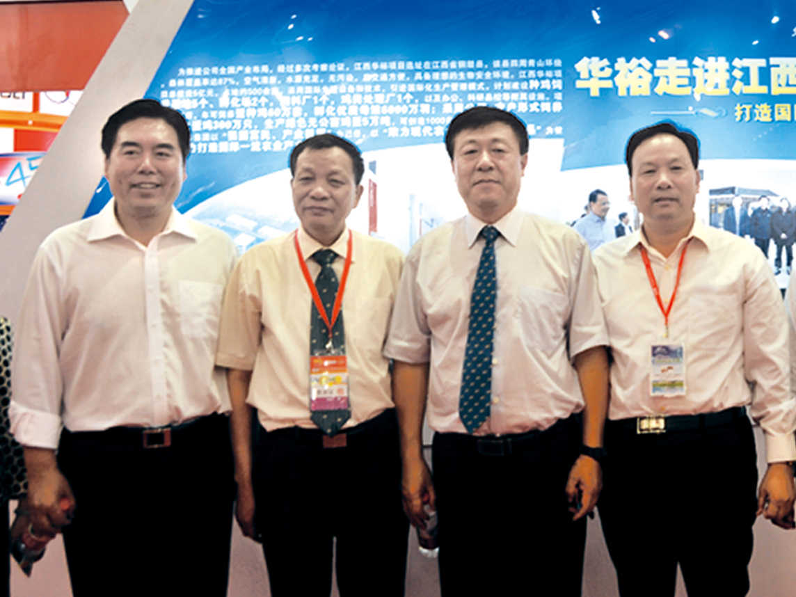 農(nóng)業(yè)部副部長于康震(左三),中國畜牧業(yè)協(xié)會第四屆理事會會長、主席團(tuán)主席李希榮(左一)農(nóng)業(yè)部原總畜牧師王智才(左二)與董事長王連增在畜博會展位合影